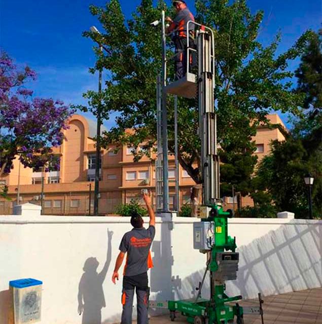 Contamos con un elevador unipersonal de hasta 9 metros, camión cesta elevadora de hasta 14 metros. Todo esto nos permite hacer la instalación en cualquier punto.